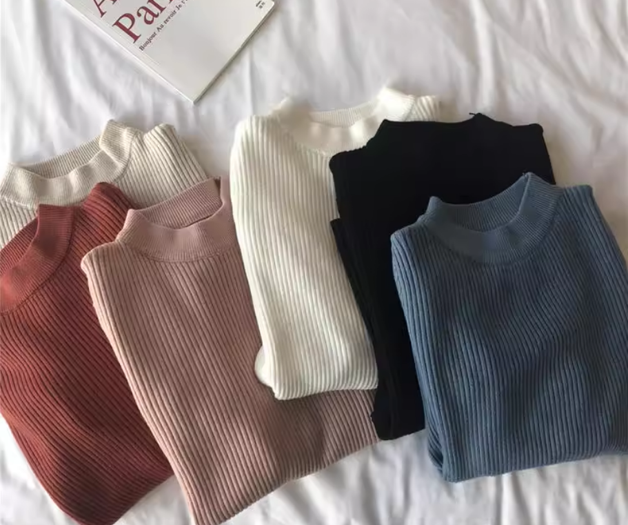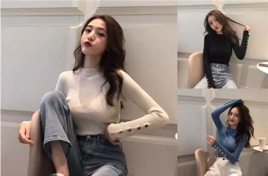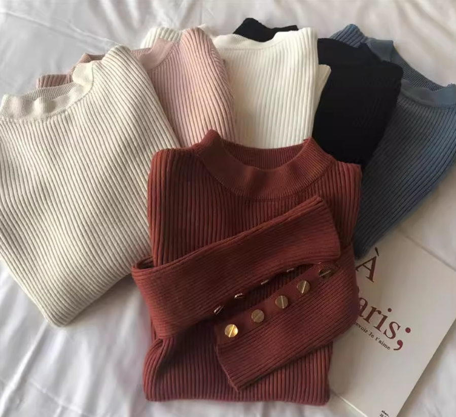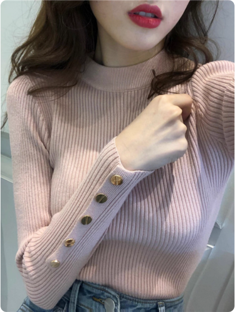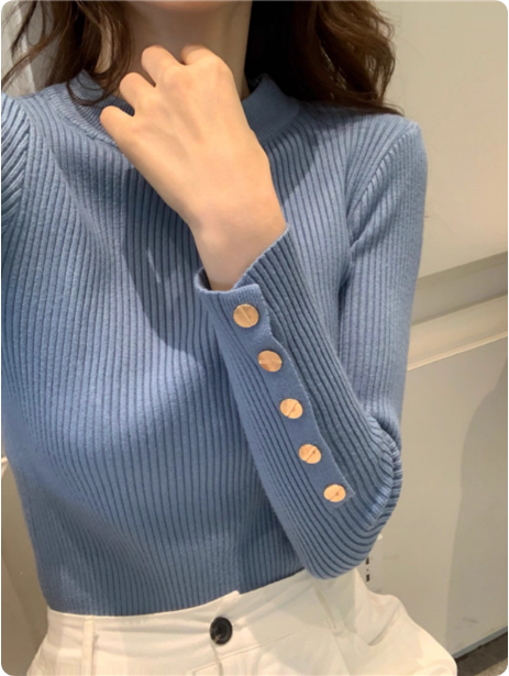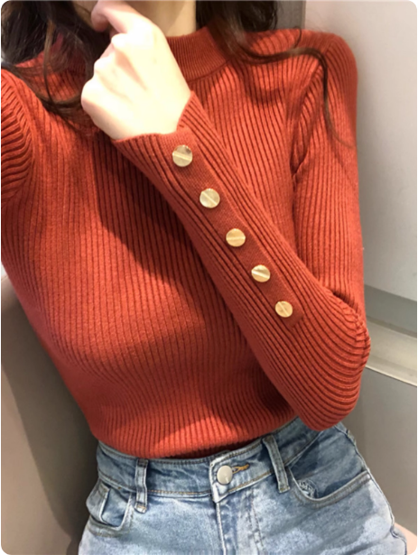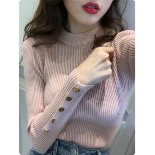 秋冬半高领毛衣女洋气百搭袖扣别致打底衫